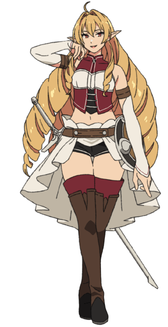 | Originaire du Royaume d’Asura. Elle est une aventurière de rang B qui utilise son arc comme arme. Elle est plus jeune que les autres membres du groupe, et elle y connue pour sa beauté et ses cheveux blonds et respectée pour sa volonté à toutes épreuves. |